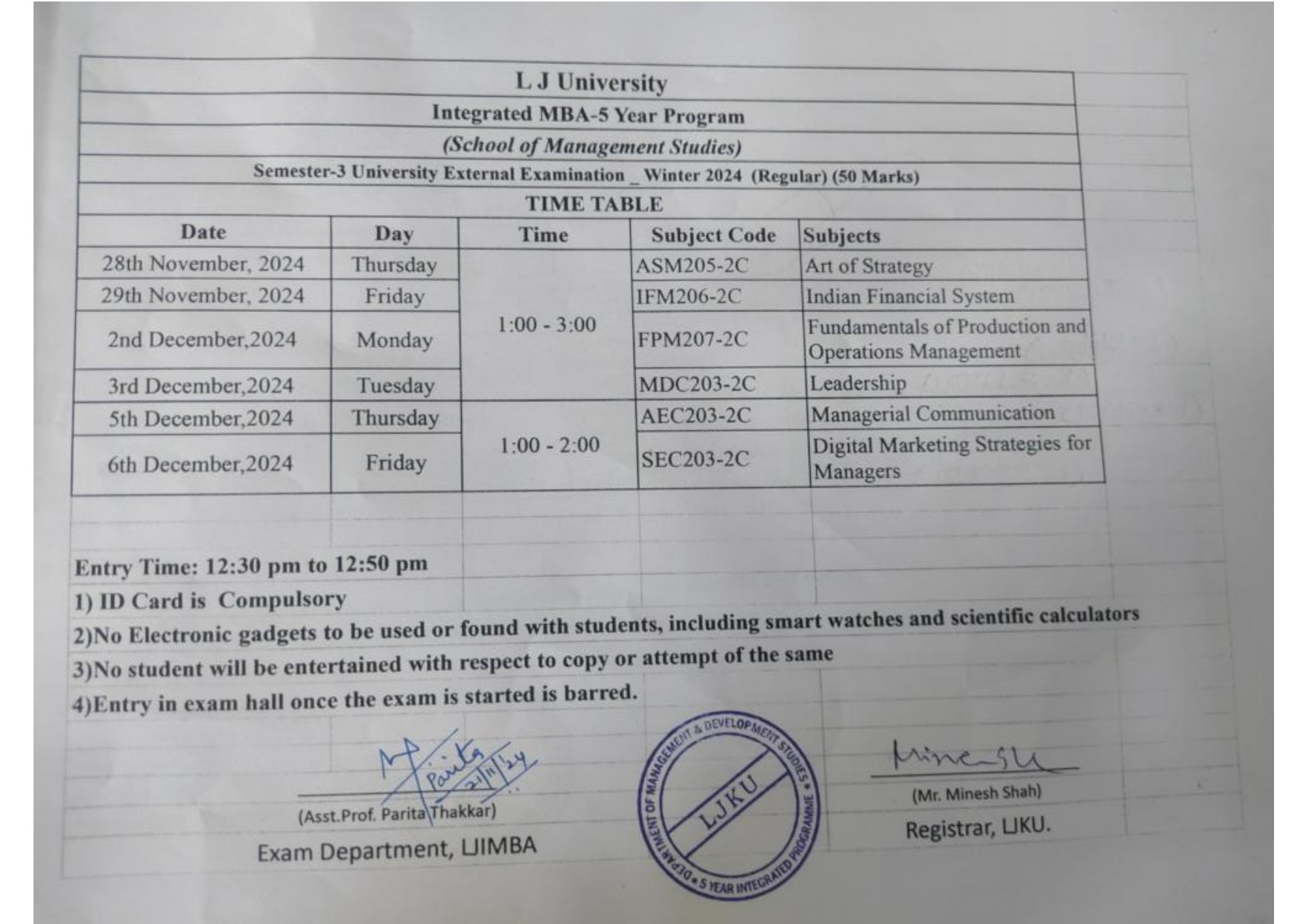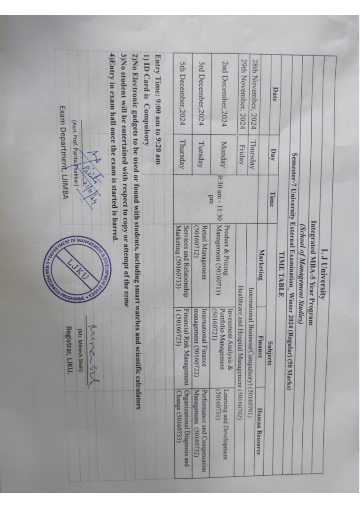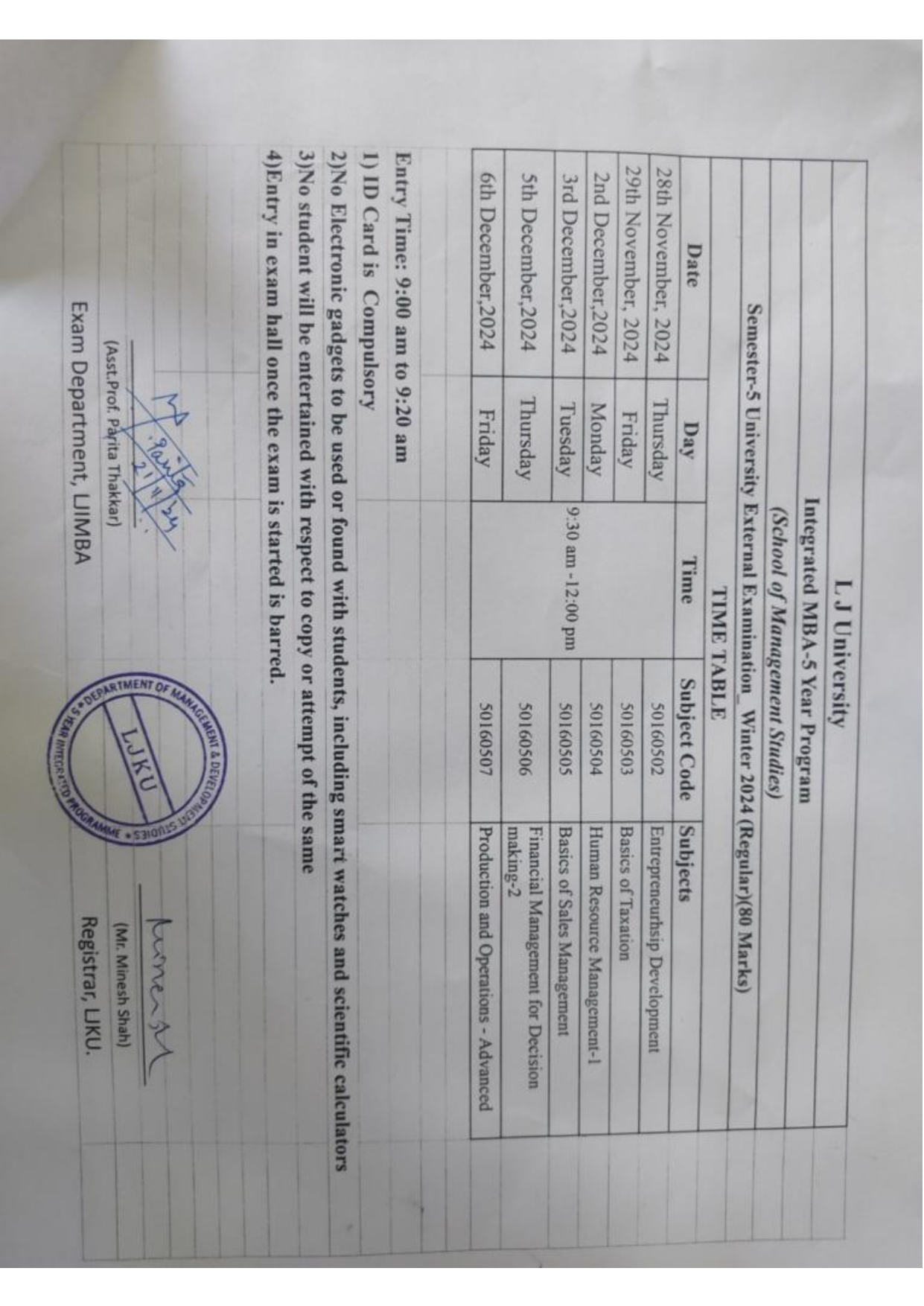 22.11.24: Semester 5 University Winter 2024 Examination (External Regular) Time Table