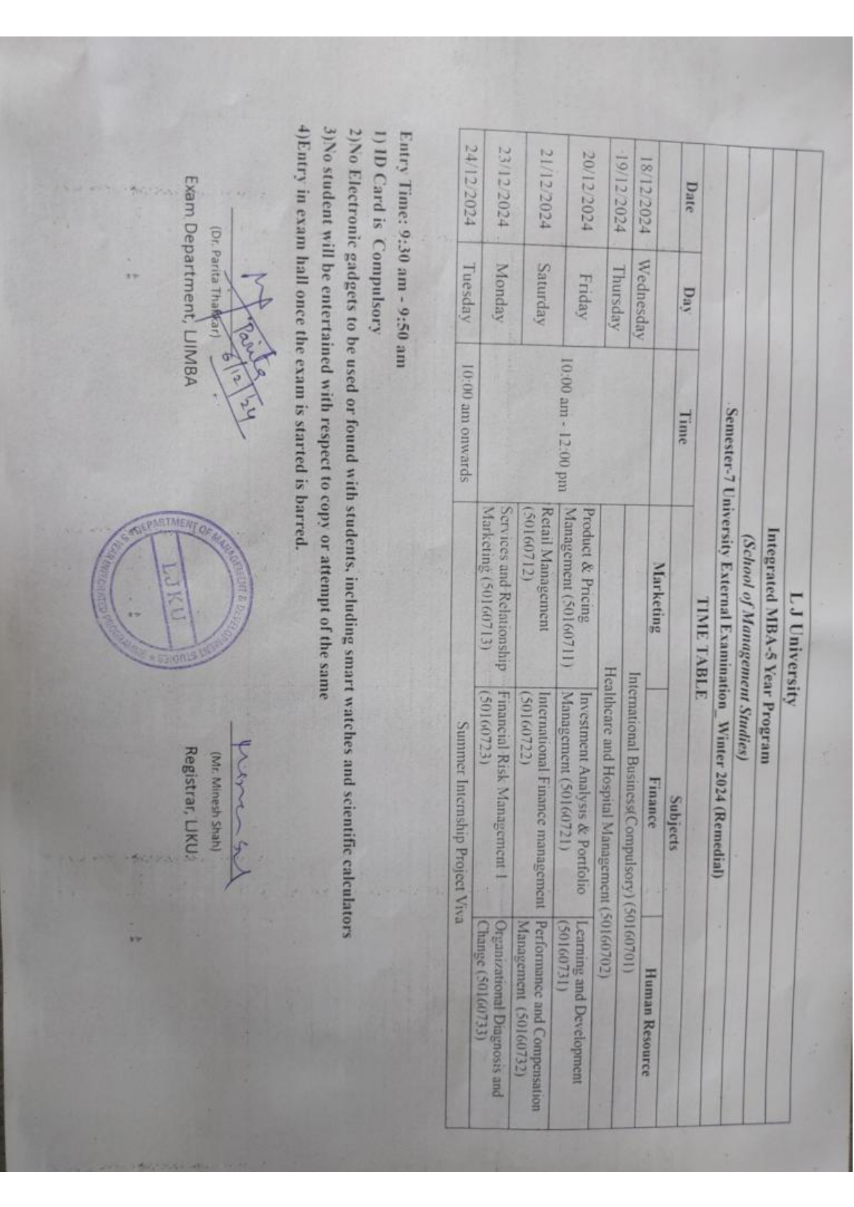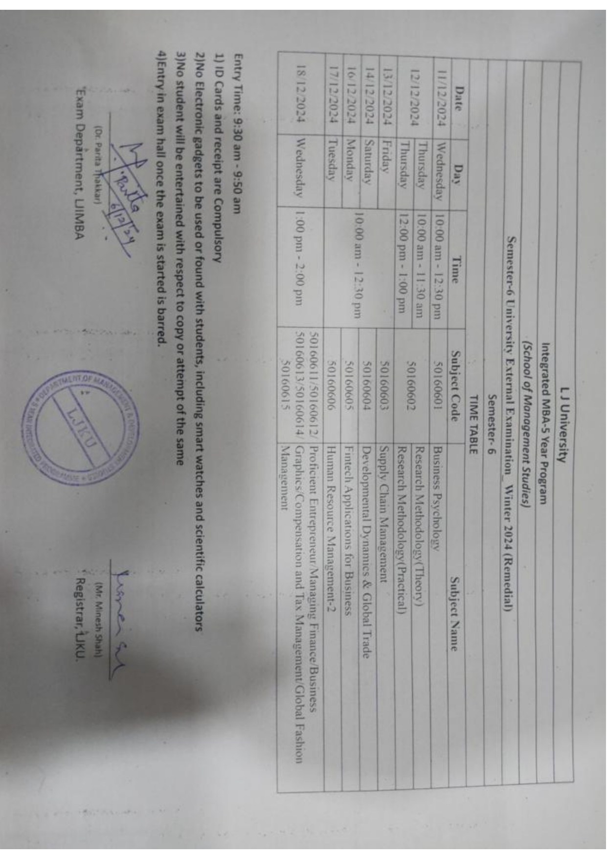 10.12.24: Semester 6 University Winter 2024 Examination (External Remedial) Time Table