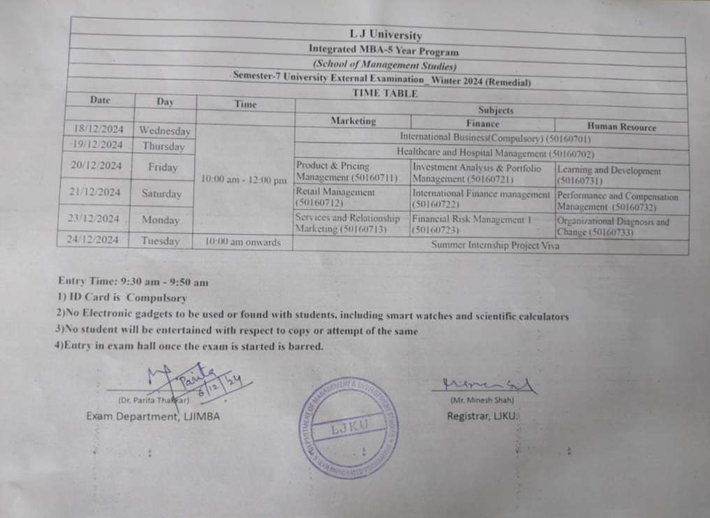 10.12.24: Semester 7 University Winter 2024 Examination (External Remedial) Time Table