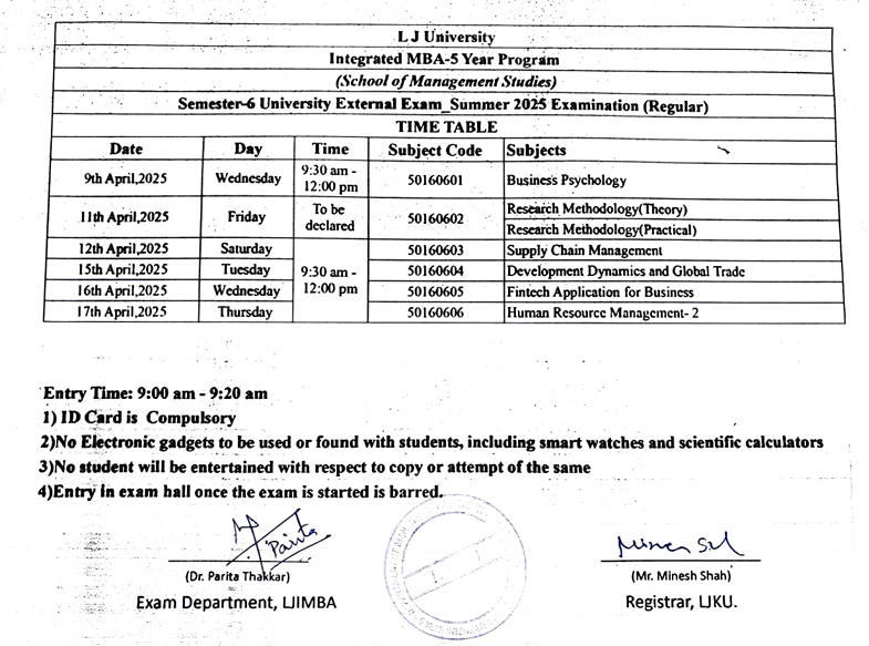07.04.25: Semester 6 University Summer 2025 Examination (External Regular) Time Table