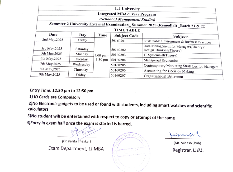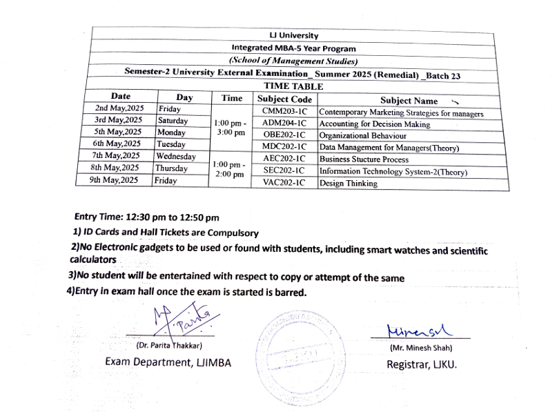 07.04.25: Semester 2 batch(23) University Summer 2025 Examination (External Remidial) Time Table