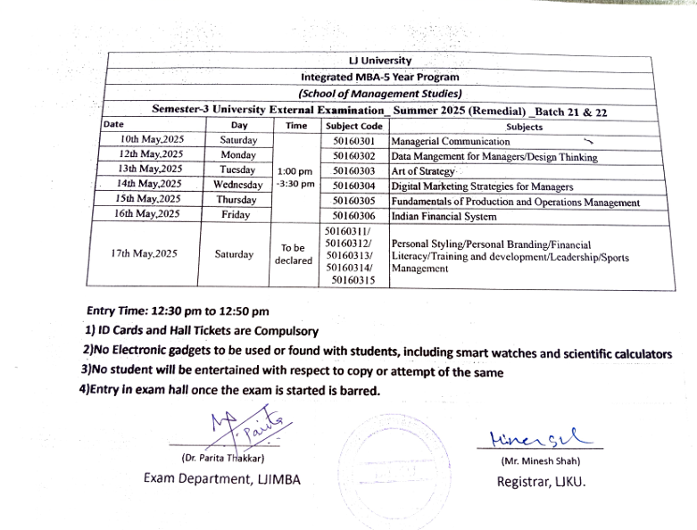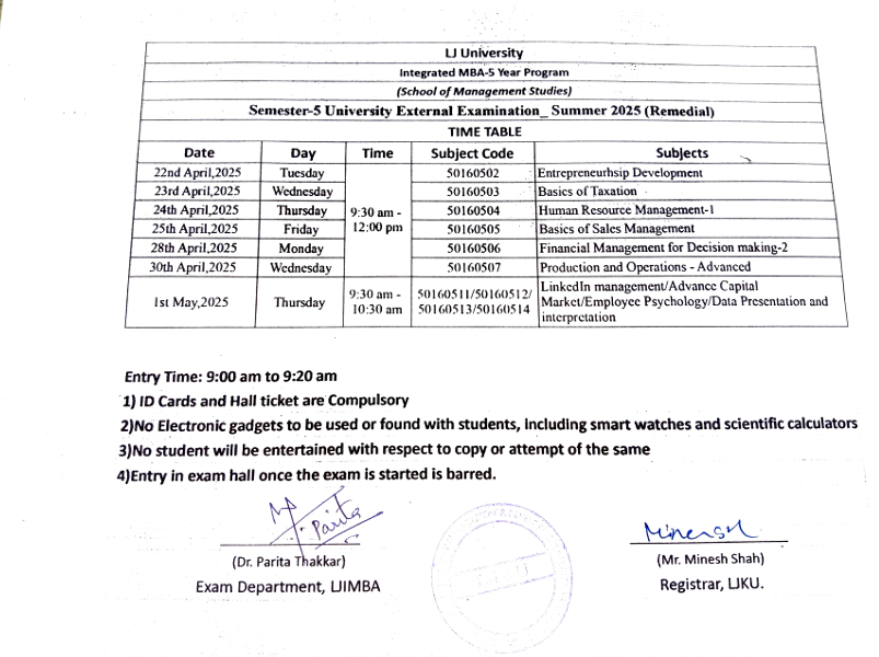 07.04.25: Semester 5 University Summer 2025 Examination (External Remidial) Time Table