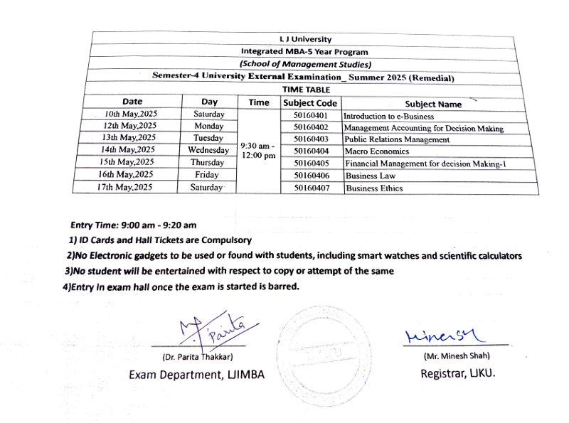 07.04.25: Semester 4 University Summer 2025 Examination (External Regular) Time Table