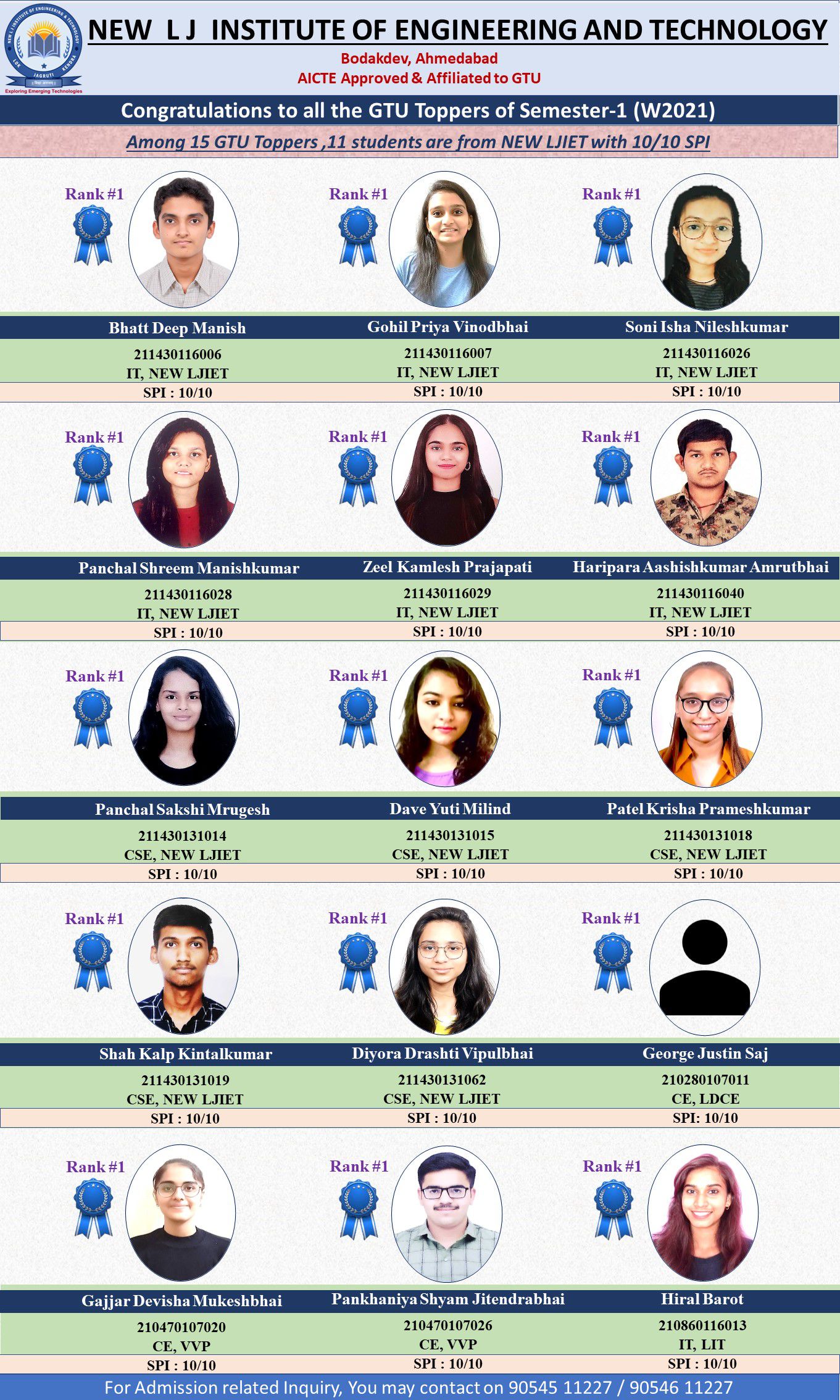 Among 15 GTU Toppers, 11 students from NLJIET have secured 10/10 SPI in GTU Semester-1 Exam that was held in Winter 2021.